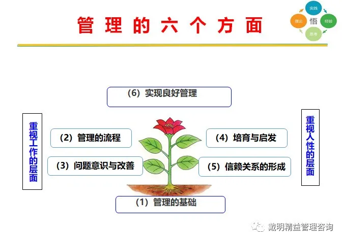 [2] 培養成熟的管理意識,重整自己的管理經(jīng)驗,掌握系統的全套管理方法和工具;建立适應企業的管理基準、共識以及共同語言,進行有意識的管理活動(dòng)。
